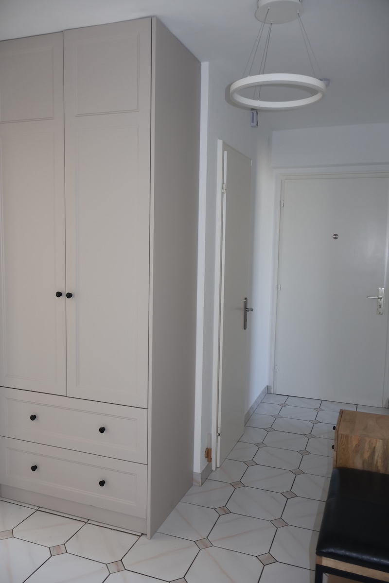 In der Diele sorgen gleich zwei praktische Einbauschränke dafür, dass Staubsauger, Vorräte und Garderobe diskret verschwinden – ein wertvoller Ersatz für eine klassische Abstellkammer, der die Wohnung stets aufgeräumt wirken lässt.