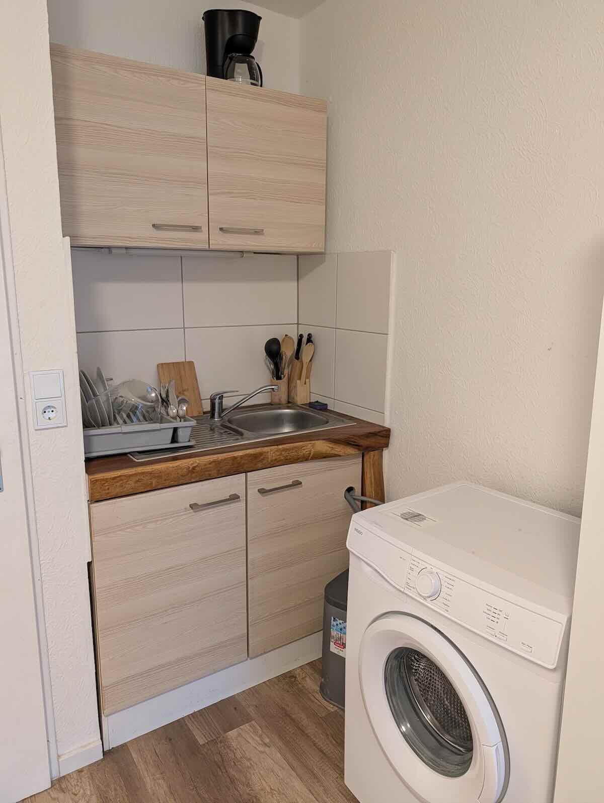 Wie auf den Bildern zu sehen, ist in der Küchenzeile bereits ein Anschluss für eine Waschmaschine vorhanden bzw. ein Gerät integriert.