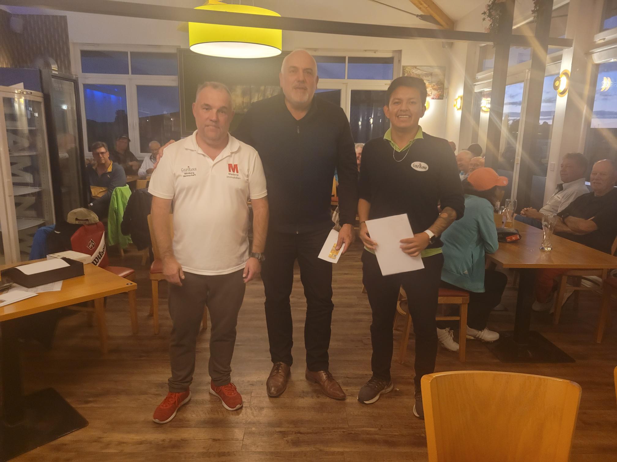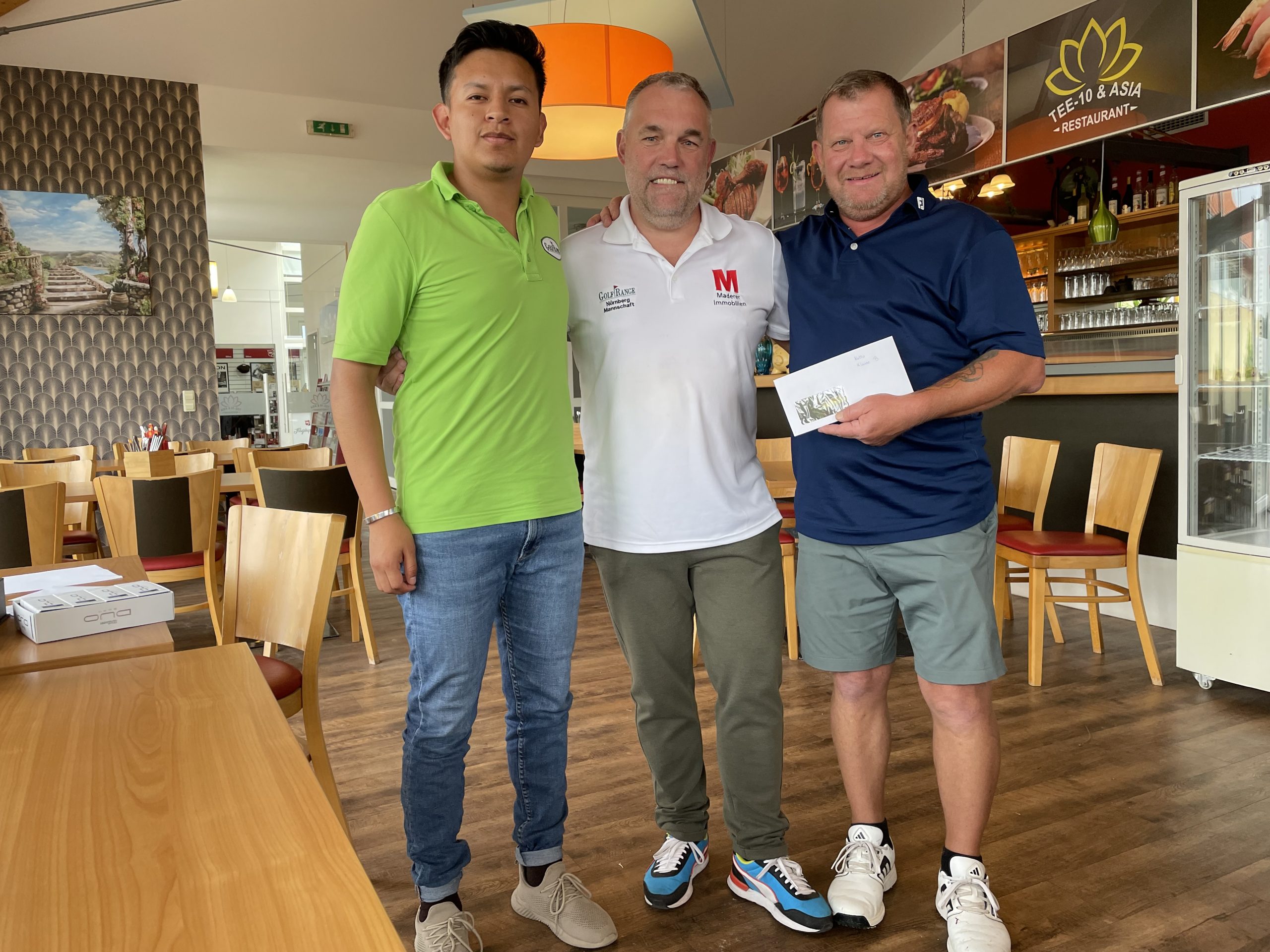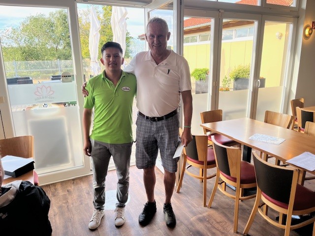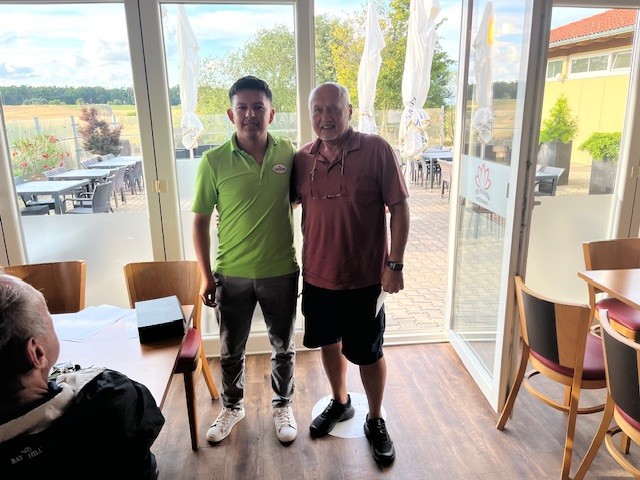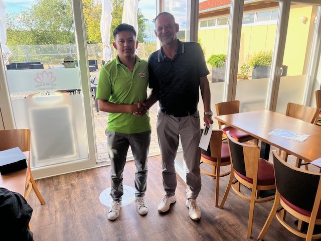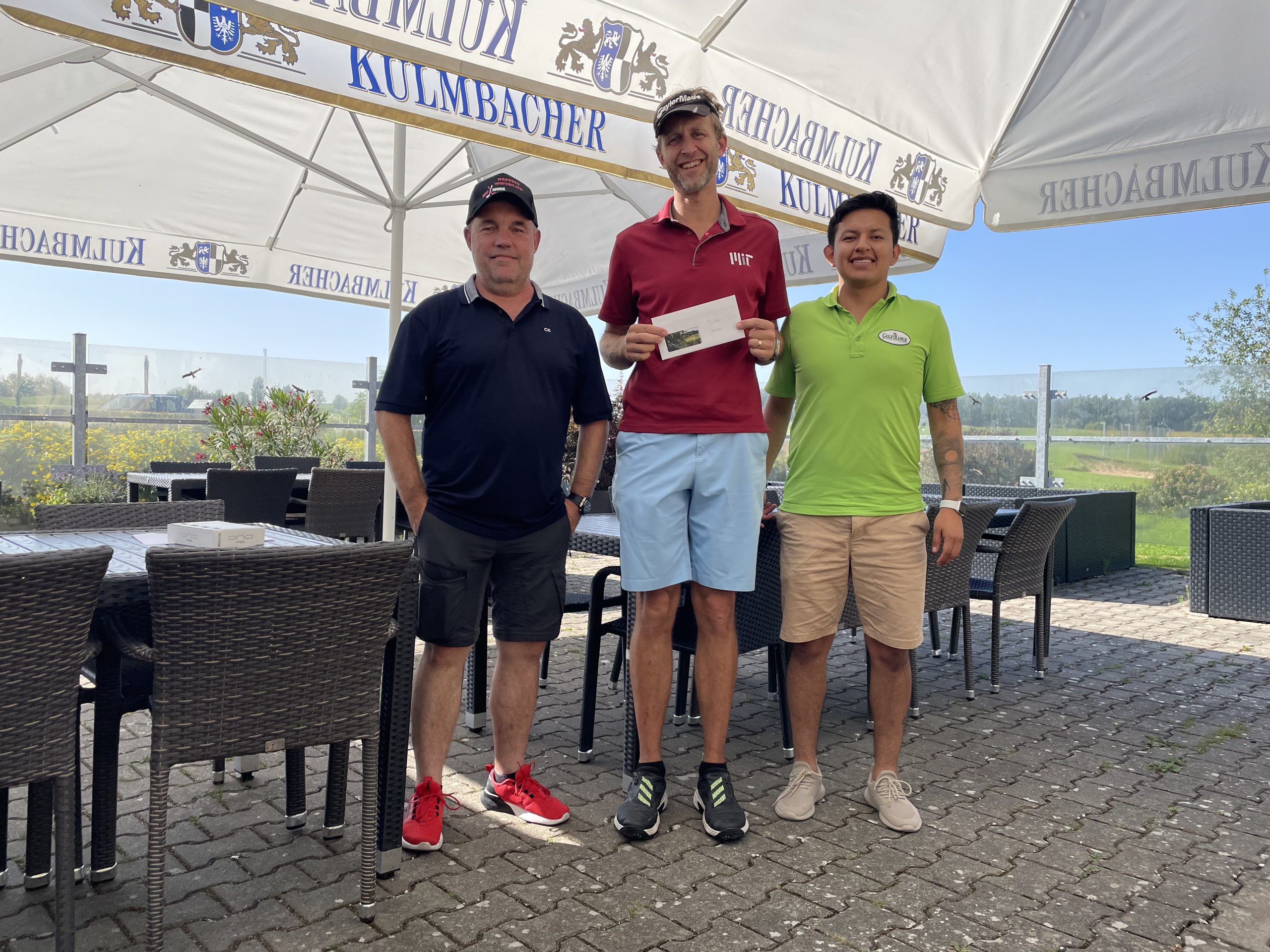 Aber der Reihe nach: Es war diesmal richtig spannend, denn Liu spielte zwar sehr gutes Golf, das Verfolgerfeld war ihm aber dicht auf den Fersen. Am Ende lag er mit 15 Punkten in der Bruttowertung knapp vor dem erneut stark auftrumpfenden Klaus Herles und Thomas Riedel, die beide 13 Bruttopunkte erspielten.