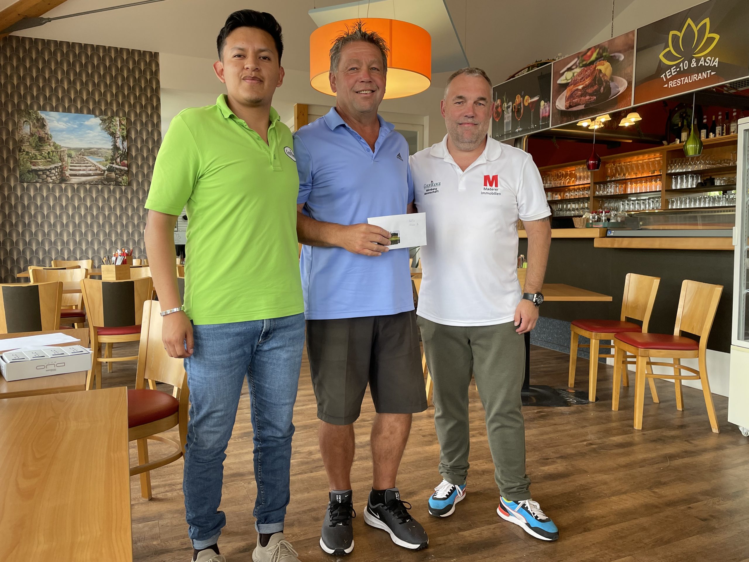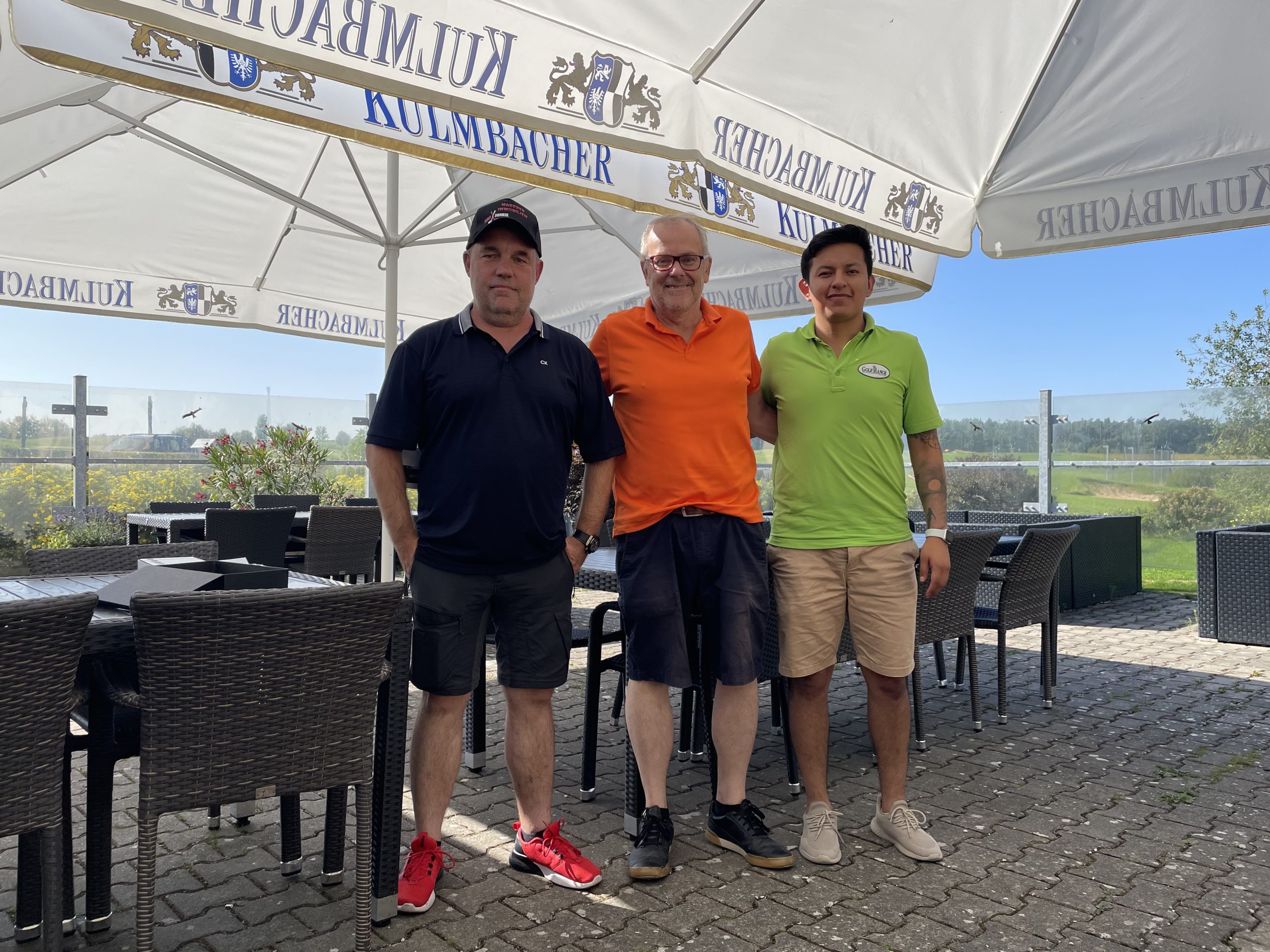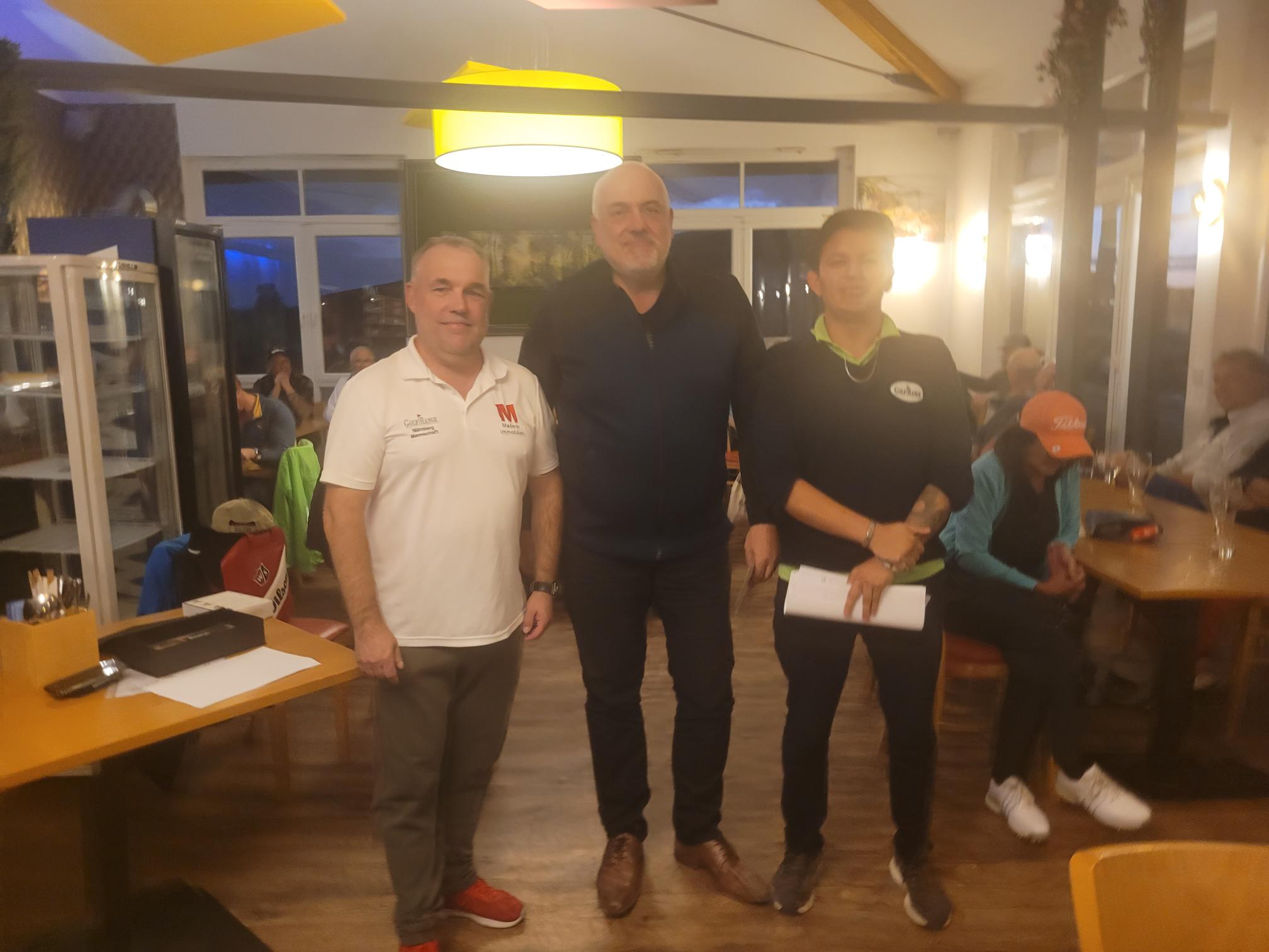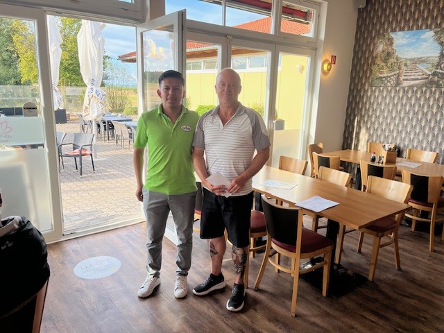 Aber der Reihe nach: Es war diesmal richtig spannend, denn Liu spielte zwar sehr gutes Golf, das Verfolgerfeld war ihm aber dicht auf den Fersen. Am Ende lag er mit 15 Punkten in der Bruttowertung knapp vor dem erneut stark auftrumpfenden Klaus Herles und Thomas Riedel, die beide 13 Bruttopunkte erspielten.