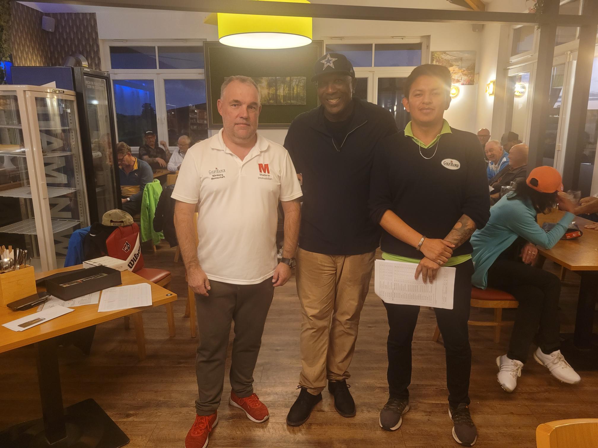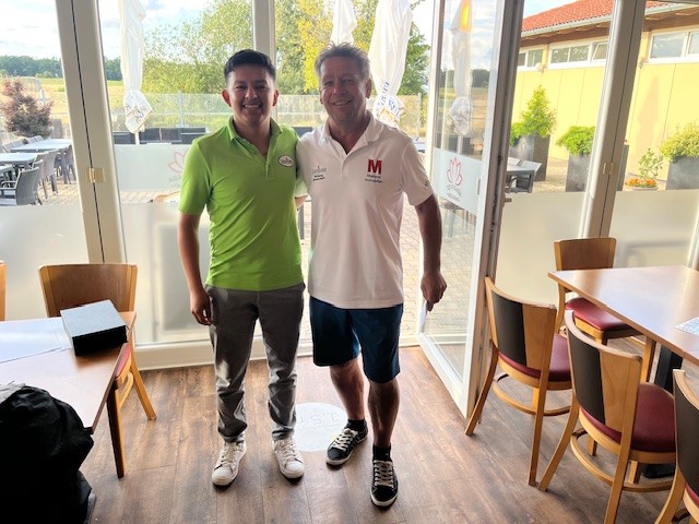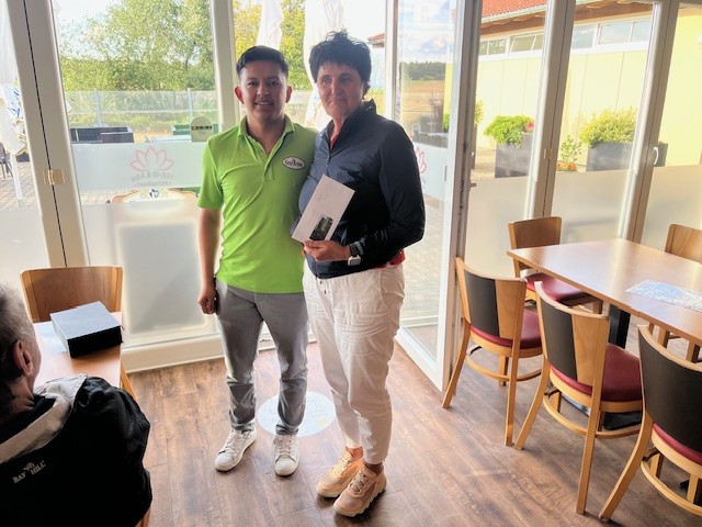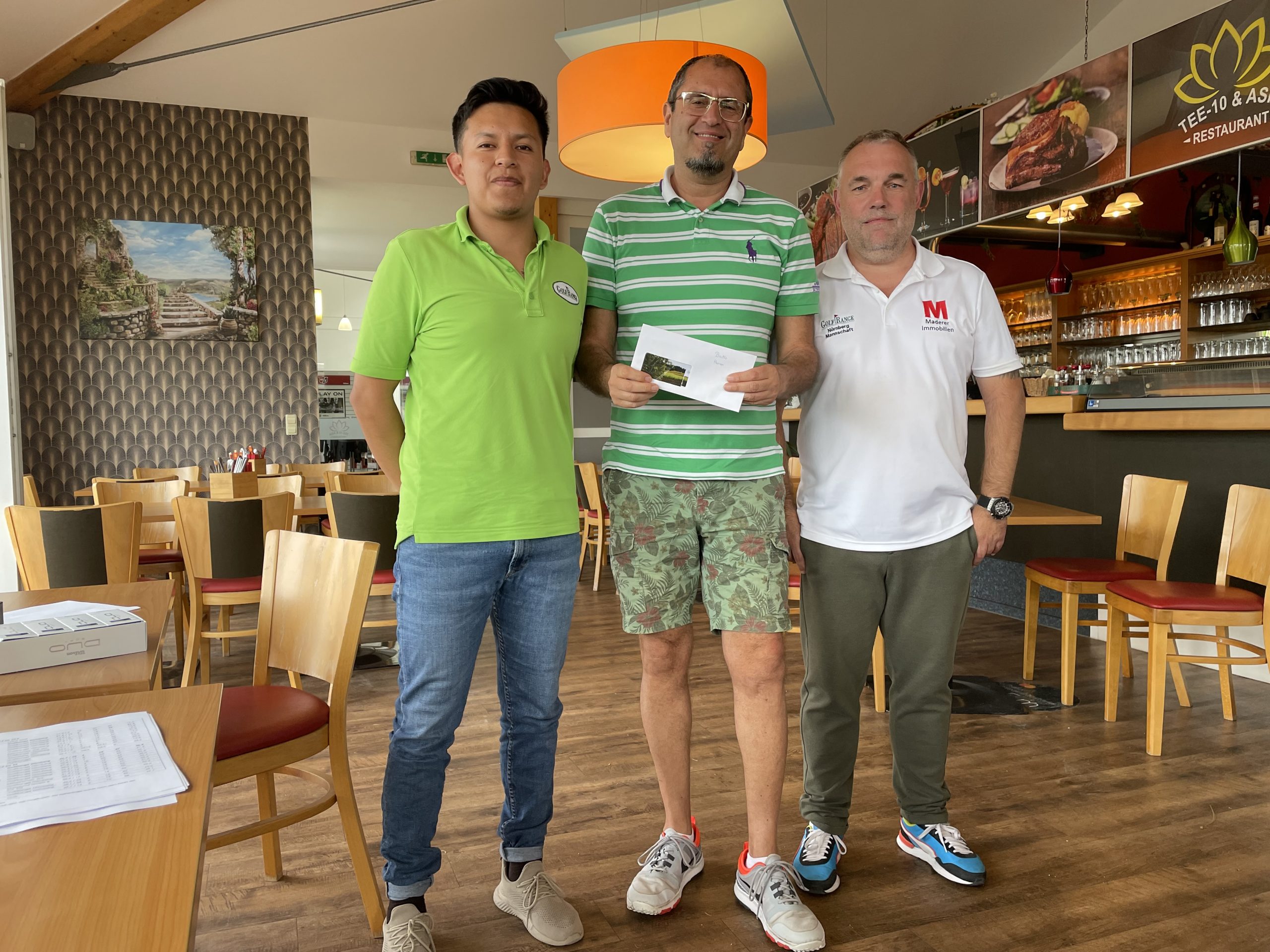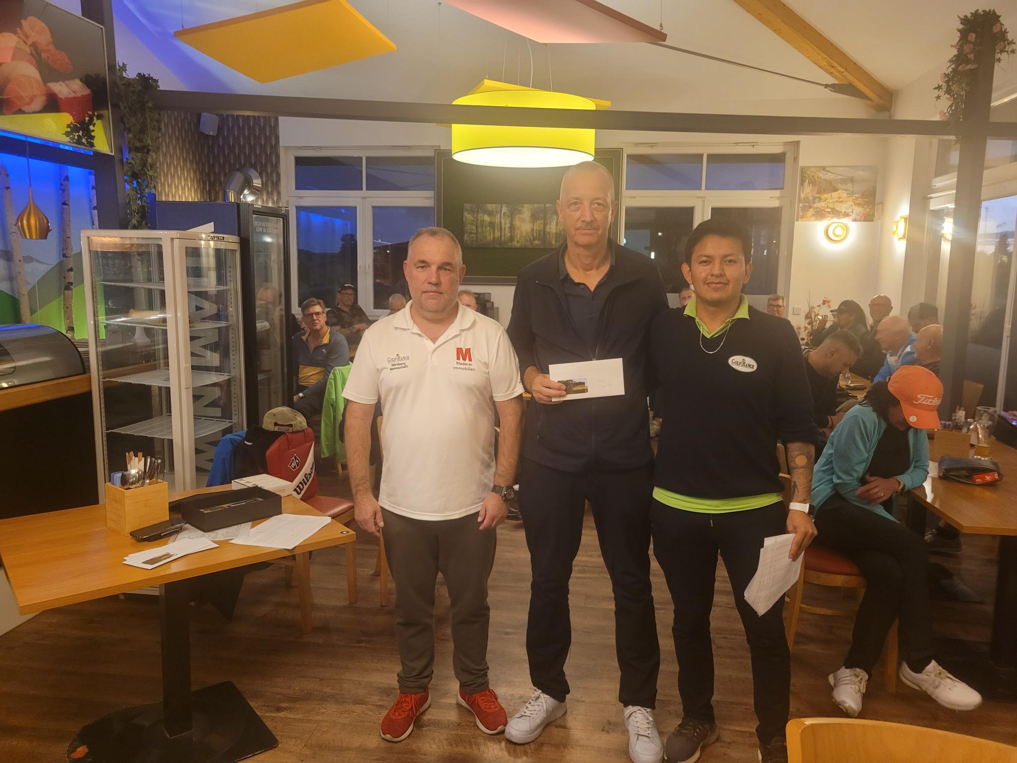 Aber der Reihe nach: Es war diesmal richtig spannend, denn Liu spielte zwar sehr gutes Golf, das Verfolgerfeld war ihm aber dicht auf den Fersen. Am Ende lag er mit 15 Punkten in der Bruttowertung knapp vor dem erneut stark auftrumpfenden Klaus Herles und Thomas Riedel, die beide 13 Bruttopunkte erspielten.