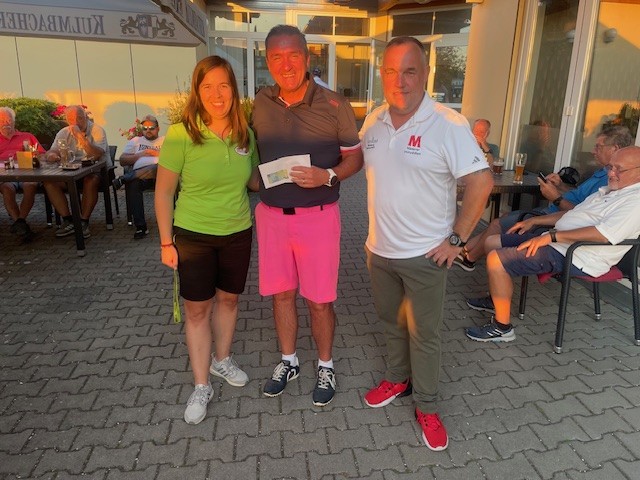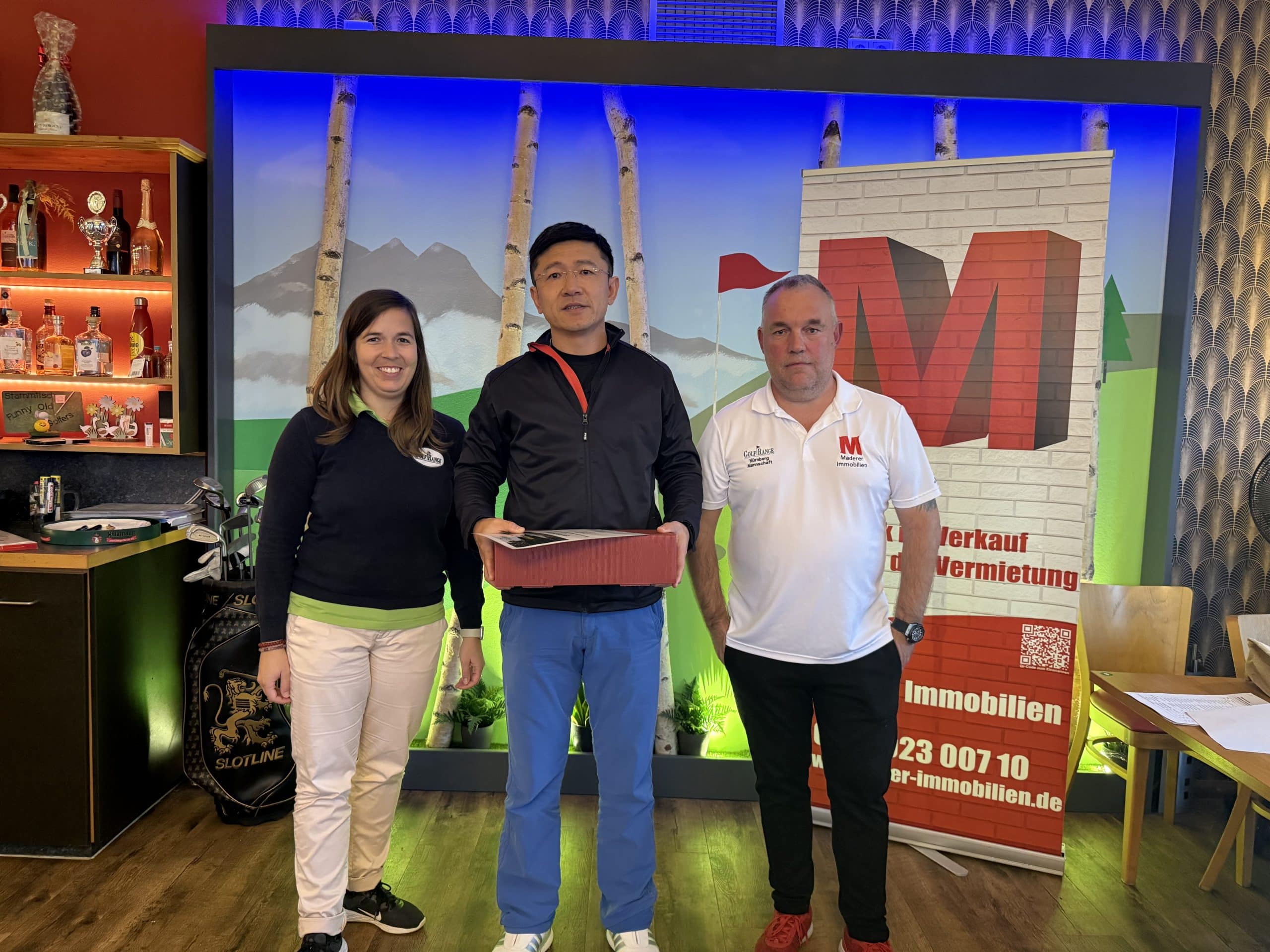 Strahlen durften aber noch Zwei: Petra Kindler gewann die Nettoklasse B mit imponierenden 27 Punkten. Und der Birdie-Pool? Der lag diesmal bei 135 Euro und wurde geknackt von: Ja, von Xinyu Liu. Hatte er sich aber mit drei Birdies auf den neun Löchern der GolfRange auch redlich verdient.